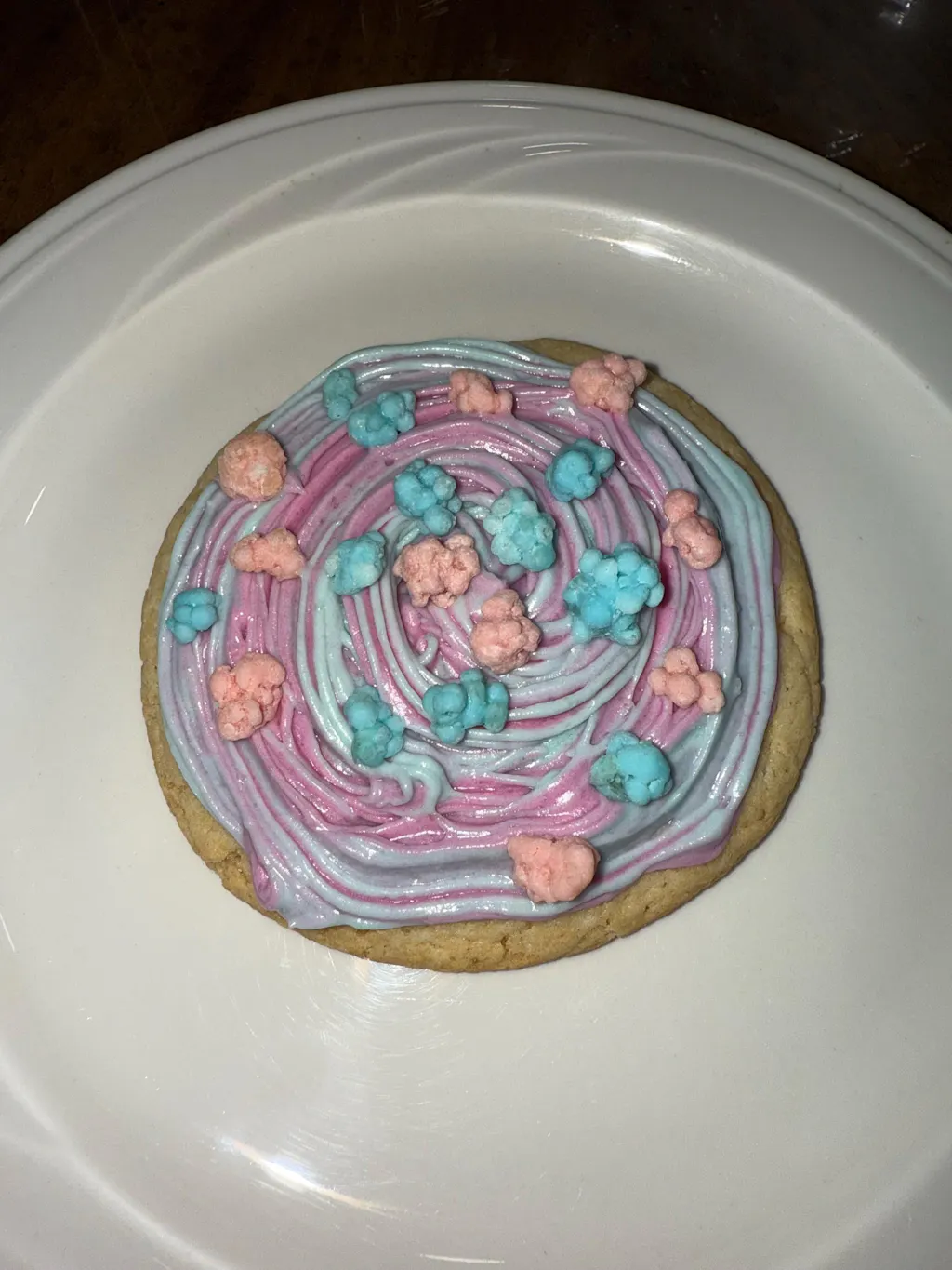 - Clusters of pink and blue coated popping candy and rice crisps